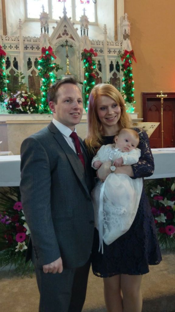 Previous Image Next Image 8DA5744C-2D00-47BC-9985-C31704EB390B Doireann Lily O’Connell on her baptism day witn her parents Stephanie and Gareth.