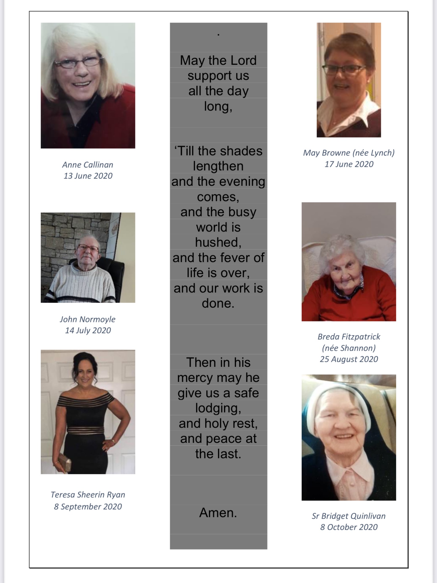 - Mass for the feast of All Souls (Monday 2 November) will be celebrated at 7pm in St Michael’s Church, Kildysart. Due to the public health emergency it will not be possible to have a congregation present but the Mass will be livestreamed on the Kildysart parish facebook page. The Mass will be offered for parishioners and relations of parishioners of Kildysart and Coolmeen-Cranny parishes who have died since last November. If you would like to have a loved one included in this Mass you are welcome to contact our pastoral office by telephone or e mail.